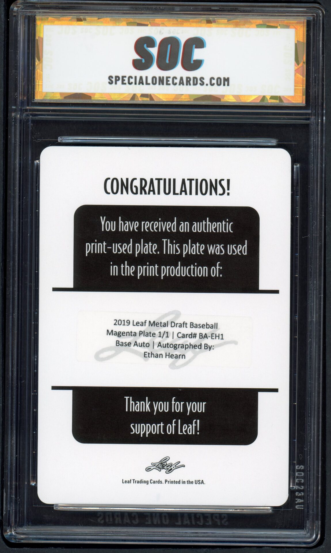 Special One Cards (SOC) only authenticates one card per series with their motto “There may be many, but they are not the special one”. Granting as a consequence the status of “SOC POP1” to all of their authentications and the status of “Masterpiece” to the real 1/1s. SOC cards are slabbed using the most security features out of any player in the industry.